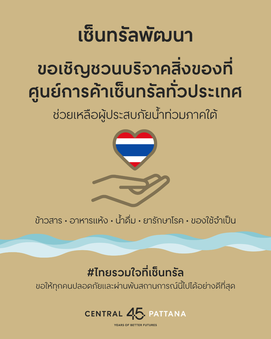 เซ็นทรัลพัฒนาให้ความสำคัญกับการช่วยเหลือชุมชนในทุกสถานการณ์ และยังคงติดตามสถานการณ์น้ำท่วมในพื้นที่ต่าง ๆ อย่างใกล้ชิด พร้อมเปิดพื้นที่ศูนย์การค้าเพื่อสนับสนุนการส่งต่อสิ่งของจำเป็นไปยังผู้ที่ได้รับผลกระทบอย่างเร่งด่วนและทั่วถึง เราหวังเป็นอย่างยิ่งว่าสถานการณ์จะคลี่คลายโดยเร็ว และขอร่วมเป็นส่วนหนึ่งในการช่วยให้ทุกคนผ่านพ้นวิกฤตครั้งนี้ไปได้อย่างปลอดภัย